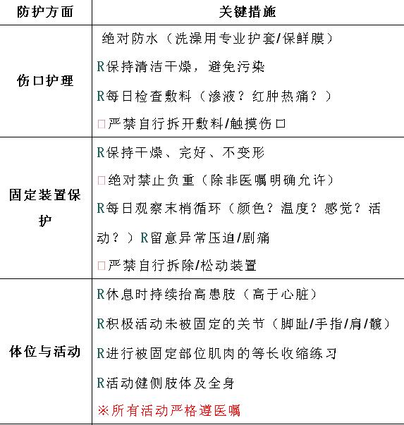 骨折術(shù)后拆線前的階段(通常為術(shù)后7-14天)是傷口愈合和早期穩(wěn)定的關(guān)鍵時期,特別是未拆線出院的患者做好自我防護至關(guān)重要,能有效預防感染、促進愈合、避免并發(fā)癥。以下是詳細的自我防護清單: