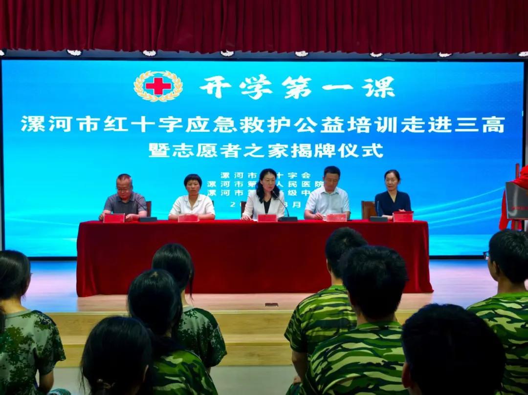 現(xiàn)場,郭俊偉向“漯河市第三高級中學(xué)紅十字應(yīng)急救護(hù)社團(tuán)”代表授旗,孫潁華和胡海英共同為“紅十字志愿者之家”揭牌。