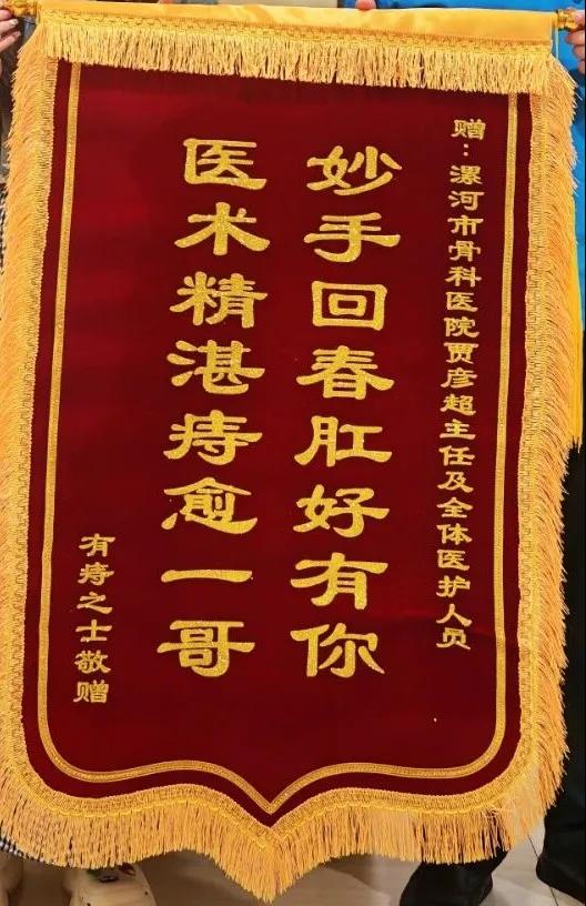 近日,漯河醫(yī)專(zhuān)二附院(漯河市骨科醫(yī)院、漯河市立醫(yī)院)肛腸科收到一面滿(mǎn)載心意的錦旗。患者握著賈彥超主任的手再三致謝,錦旗上“妙手回春肛好有你,醫(yī)術(shù)精湛痔愈一哥”十六個(gè)大字,既是對(duì)醫(yī)護(hù)人員專(zhuān)業(yè)能力的肯定,更是對(duì)肛腸科中西醫(yī)結(jié)合診療水平的認(rèn)可。