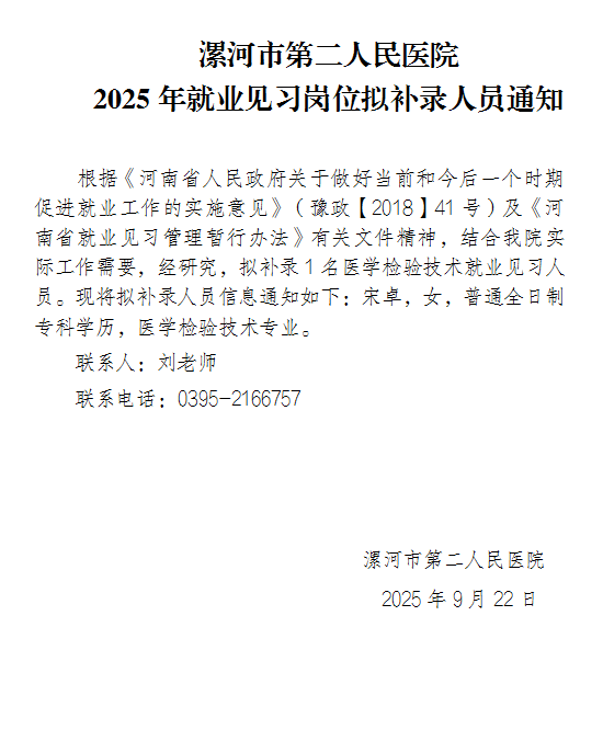 【公示】漯河市第二人民醫(yī)院2025年就業(yè)見習(xí)崗位擬補錄人員通知