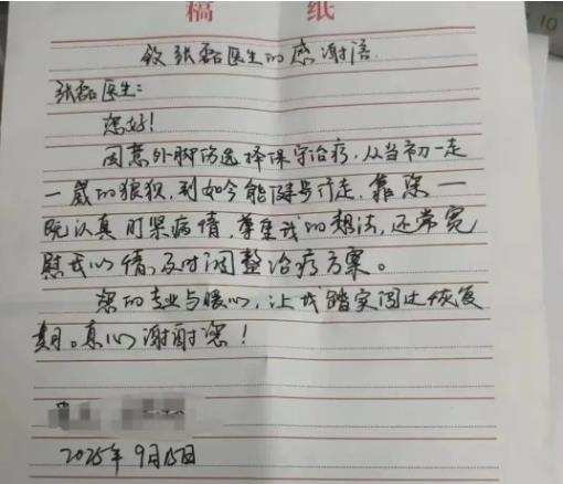 就這樣,在專業(yè)治療與耐心陪伴下,患者的腳踝一天天好轉(zhuǎn):從最初只能緩慢行走,到后來能正常上下樓梯,再到如今可以輕松散步——曾經(jīng)讓患者困擾不已的“老大難”問題,終于徹底解決。出院那天,患者特意手寫了這封感謝信,字里行間滿是真誠:“張醫(yī)生不僅治好了我的疼痛,更撫平了我心里的焦慮,這樣的好醫(yī)生,值得我們真心感謝!”