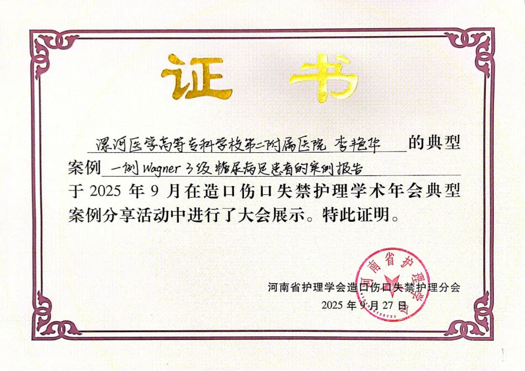 會上,漯河醫(yī)專二附院(漯河市骨科醫(yī)院、漯河市立醫(yī)院)壓力性損傷護(hù)理學(xué)組秘書、門診綜合治療室副主任護(hù)師李艷華的《一例 Wagner3級糖尿病足患者的案例報告》從全省200余例案例中脫穎而出,榮獲優(yōu)秀案例并進(jìn)行現(xiàn)場展示。這是她第二次獲此殊榮,充分彰顯了醫(yī)院在??谱o(hù)理領(lǐng)域的深厚實力與學(xué)科建設(shè)的卓越成果。