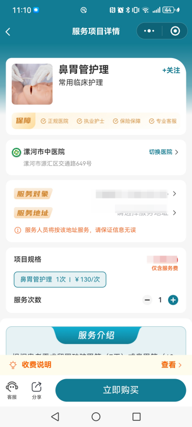 3、選擇項(xiàng)目規(guī)格,填寫“服務(wù)對(duì)象”信息與“服務(wù)地址”(首次使用需實(shí)名認(rèn)證)
