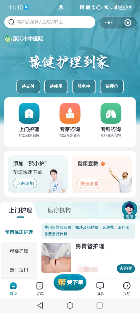 目前,漯河市中醫(yī)院居家護(hù)理上線項(xiàng)目包含鼻胃管護(hù)理、導(dǎo)尿管護(hù)理、肌肉注射、皮下注射等常用臨床護(hù)理,新生兒測(cè)黃疸、新生兒臀部護(hù)理、產(chǎn)后會(huì)陰傷口護(hù)理、產(chǎn)后乳房護(hù)理等母嬰護(hù)理,特殊造口護(hù)理、疑難造口護(hù)理、失禁性皮炎護(hù)理等傷口造口護(hù)理,PICC護(hù)理、輸液港護(hù)理,灸法、中藥涂藥、刮痧、耳穴貼壓等中醫(yī)護(hù)理共7大類51項(xiàng)。居民通過(guò)手機(jī)端足不出戶即可在線預(yù)約居家護(hù)理服務(wù),執(zhí)業(yè)護(hù)士“一鍵接單”,提供專業(yè)的上門居家護(hù)理服務(wù),免去人民群眾奔波醫(yī)院之苦,讓優(yōu)質(zhì)護(hù)理服務(wù)觸手可及。