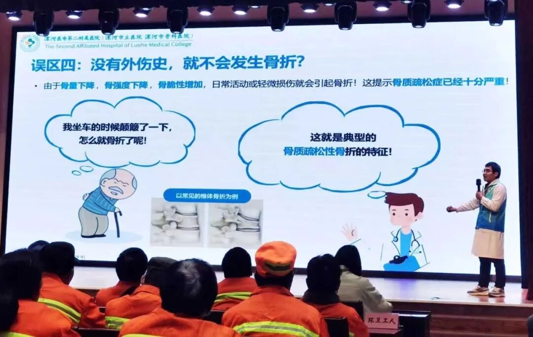 活動中,漯河醫(yī)專二附院骨科專家王松茂聚焦10月20日“世界骨質(zhì)疏松日”主題,針對基層群眾尤其是環(huán)衛(wèi)工人的工作特點,開展骨質(zhì)疏松專題健康科普講座。講座內(nèi)容貼合群眾需求,從骨質(zhì)疏松的成因、早期癥狀、預(yù)防方法到日常養(yǎng)護要點,進行了通俗細致的講解,幫助群眾建立科學(xué)的骨骼健康認知,為預(yù)防骨質(zhì)疏松奠定基礎(chǔ)。