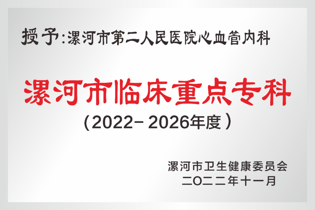 科室是國家級胸痛中心、國家心血管疾病臨床研究中心科研基地、河南省高血壓防治中心成員單位、漯河市臨床重點???、漯河市心衰聯(lián)盟成員單位等專業(yè)殊榮,先后榮獲漯河市青年五四獎章集體、市衛(wèi)健系統(tǒng)先進集體、市衛(wèi)健系統(tǒng)優(yōu)秀醫(yī)師團隊、市衛(wèi)健系統(tǒng)優(yōu)秀護理團隊等榮譽稱號。(伊獻麗)