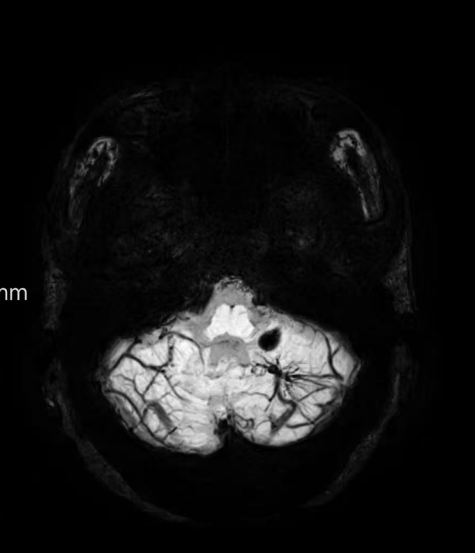 我們大腦里密密麻麻的靜脈血管,在常規(guī)影像上是“灰蒙蒙”的一片。但SWI對脫氧血液極其敏感,能將靜脈血管清晰地顯示為黑色的細線。這個本領非常有用: