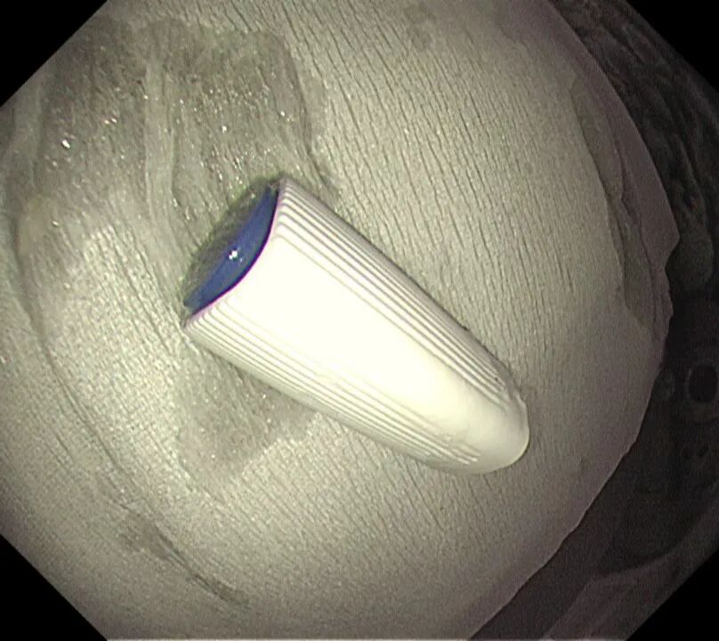 時間不等人,雖已臨近晚7點,市二院第一時間啟動應(yīng)急響應(yīng)機制,內(nèi)鏡室、麻醉科醫(yī)護技立即返崗就位,并經(jīng)院辦等職能部門積極協(xié)調(diào),盡可能縮短術(shù)前準(zhǔn)備時間,迅速制定了取出異物的方案。隨后,在全身麻醉下,朗朗安然入睡,醫(yī)生通過纖細的胃鏡,精準(zhǔn)地找到了那個“惹事”的筆帽位于十二指腸內(nèi),并順利將其取出。整個過程僅用時十幾分鐘,朗朗術(shù)后很快蘇醒,觀察無礙后平安回家。
