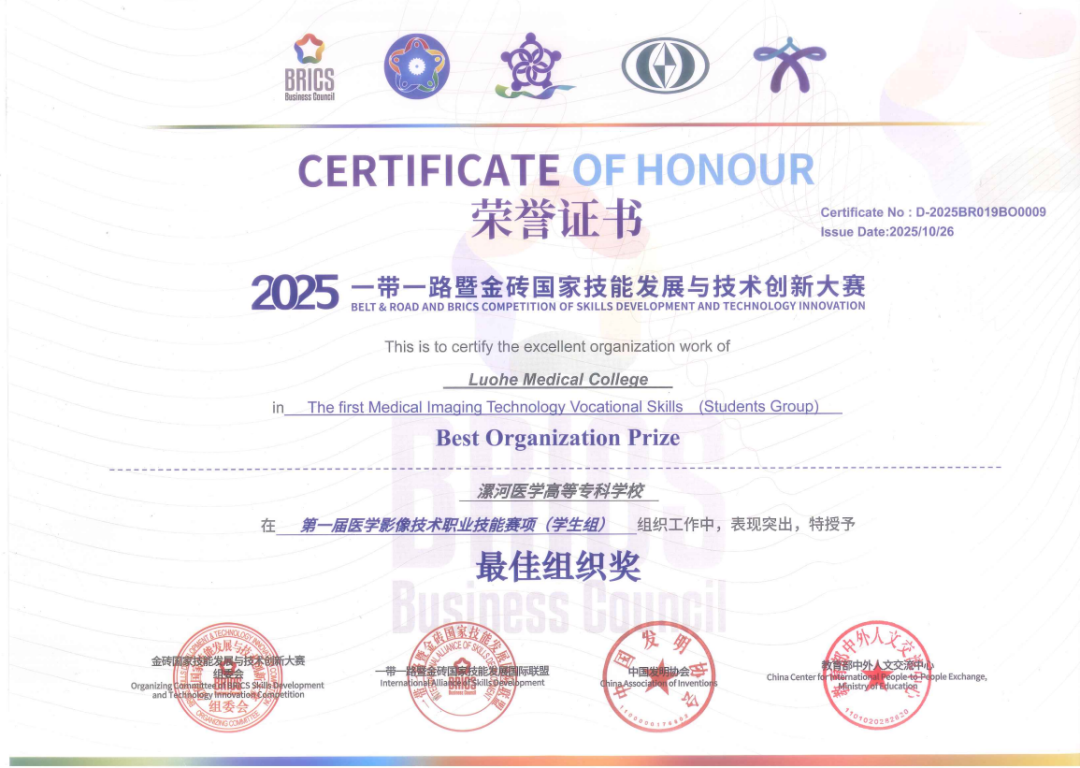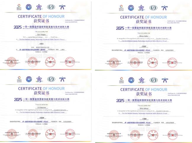 10月23日至26日,2025“一帶一路”暨金磚國家技能發(fā)展與技術(shù)創(chuàng)新大賽——醫(yī)學(xué)影像技術(shù)職業(yè)技能賽項(xiàng)在北京衛(wèi)生職業(yè)學(xué)院舉行。醫(yī)學(xué)影像團(tuán)隊(duì)在周山主任帶領(lǐng)下,與來自全國61所職業(yè)院校的優(yōu)秀師生同場競技,師生團(tuán)隊(duì)奮勇爭先、發(fā)揮出色,在所有學(xué)生實(shí)踐技能比賽及教師教學(xué)比賽中均獲優(yōu)異獎(jiǎng)項(xiàng)。
