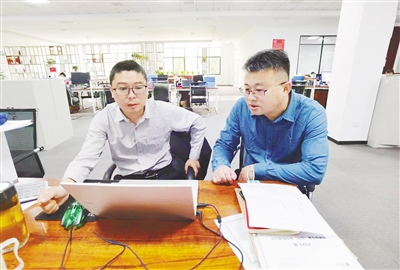 白海平(右)和同事交流。