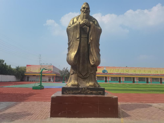 孔子巨大的木雕塑像,以“仁義禮智信”的姿態(tài)歡迎我們。兩側的敬老愛幼的典故雕像,以及習近平總書記的金句摘錄、歷代先賢的勵志名言,構成了一個別具意味的氛圍。
