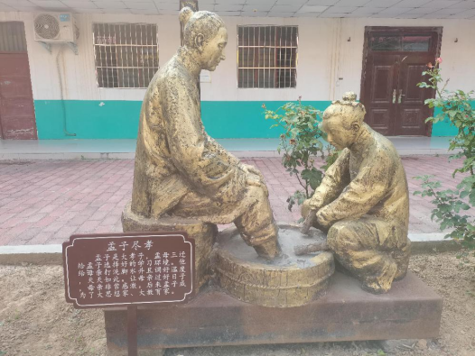 這是辦公區(qū)域。二樓以上是學生宿舍,樓梯口處的花壇花開得鮮艷而濃烈;孟子盡孝的雕像立在這里,栩栩如生······