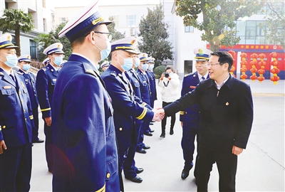 蒿慧杰、李建濤、陳先勝、陳平、李軍信、田冠亭一行先后來到市消防救援支隊、武警漯河支隊,了解節(jié)日安排、值班值守等情況。蒿慧杰指出,一直以來,市消防救援支隊和武警漯河支隊為維護漯河安全穩(wěn)定、促進高質量發(fā)展作出了積極貢獻。實踐證明,市消防救援支隊和武警漯河支隊均是召之即來、來之能戰(zhàn)、戰(zhàn)之必勝的隊伍,也是讓黨委、政府放心,讓人民群眾滿意的隊伍。我代表市委市政府向廣大消防指戰(zhàn)員和武警官兵的辛勤付出、無私奉獻表示慰問和感謝。今年是“十四五”開局之年,我市改革發(fā)展穩(wěn)定各項工作任務繁重,希望全體消防指戰(zhàn)員和武警官兵繼續(xù)發(fā)揚“舍小家為大家”的優(yōu)良傳統(tǒng)和工作作風,完善工作機制,加強隊伍建設,提升戰(zhàn)斗能力,扎實做好戰(zhàn)備執(zhí)勤、維穩(wěn)處突、消防安全等各項工作,在服務地方經濟社會發(fā)展、維護人民群眾生命財產安全上再立新功。市委、市政府將一如既往地支持駐漯部隊、武警部隊、消防隊伍的各項建設,始終如一地幫助廣大官兵和消防指戰(zhàn)員解決實際困難。