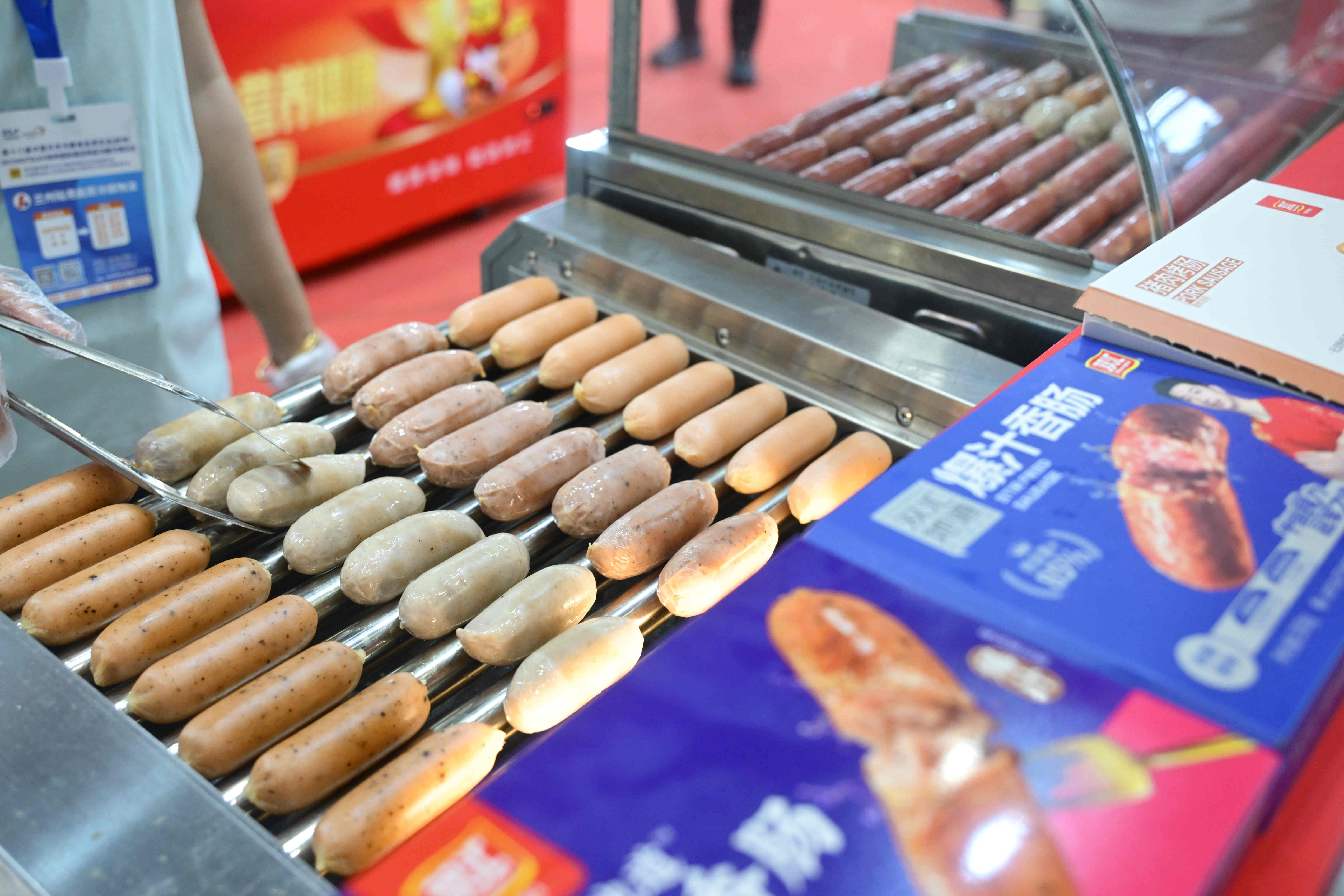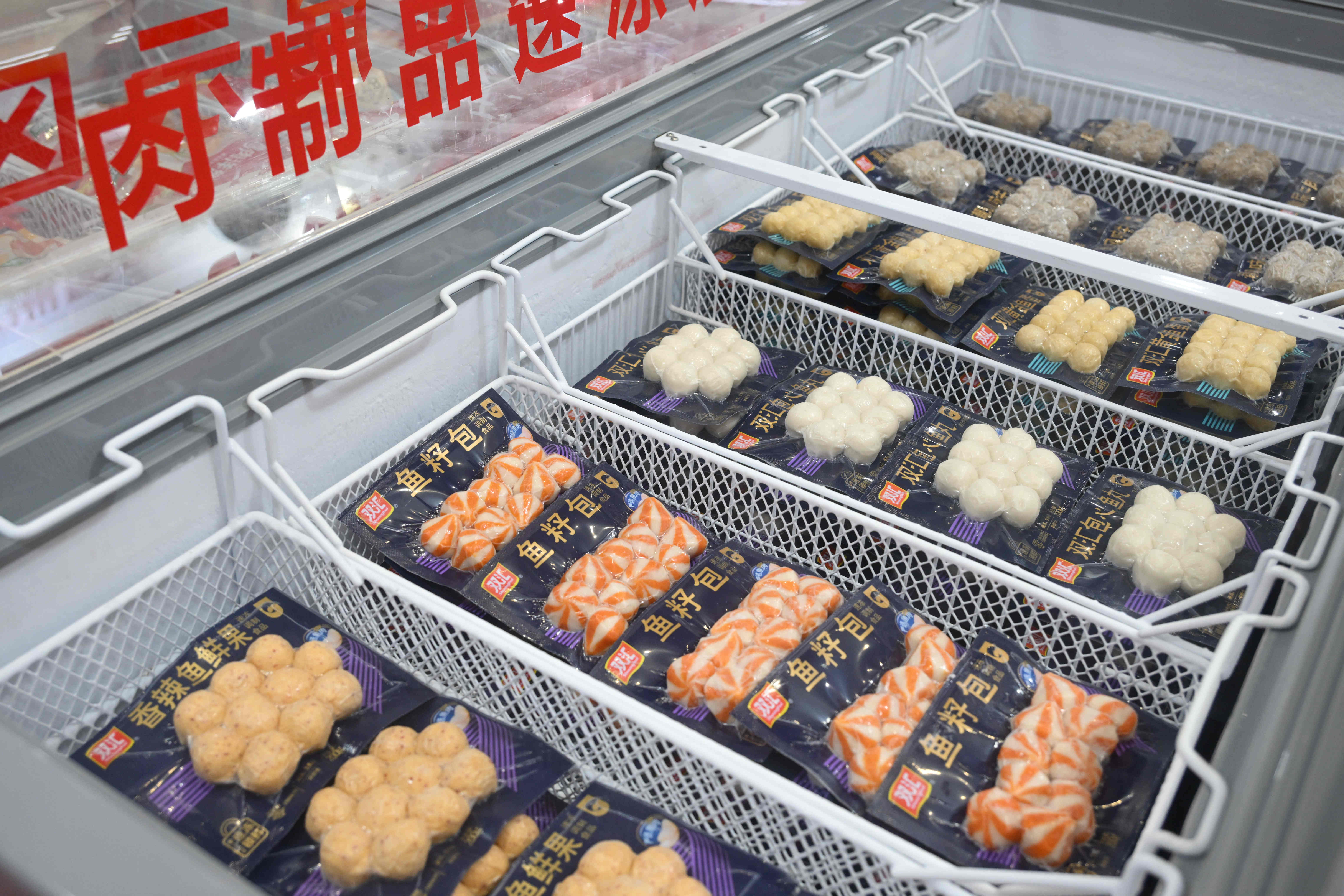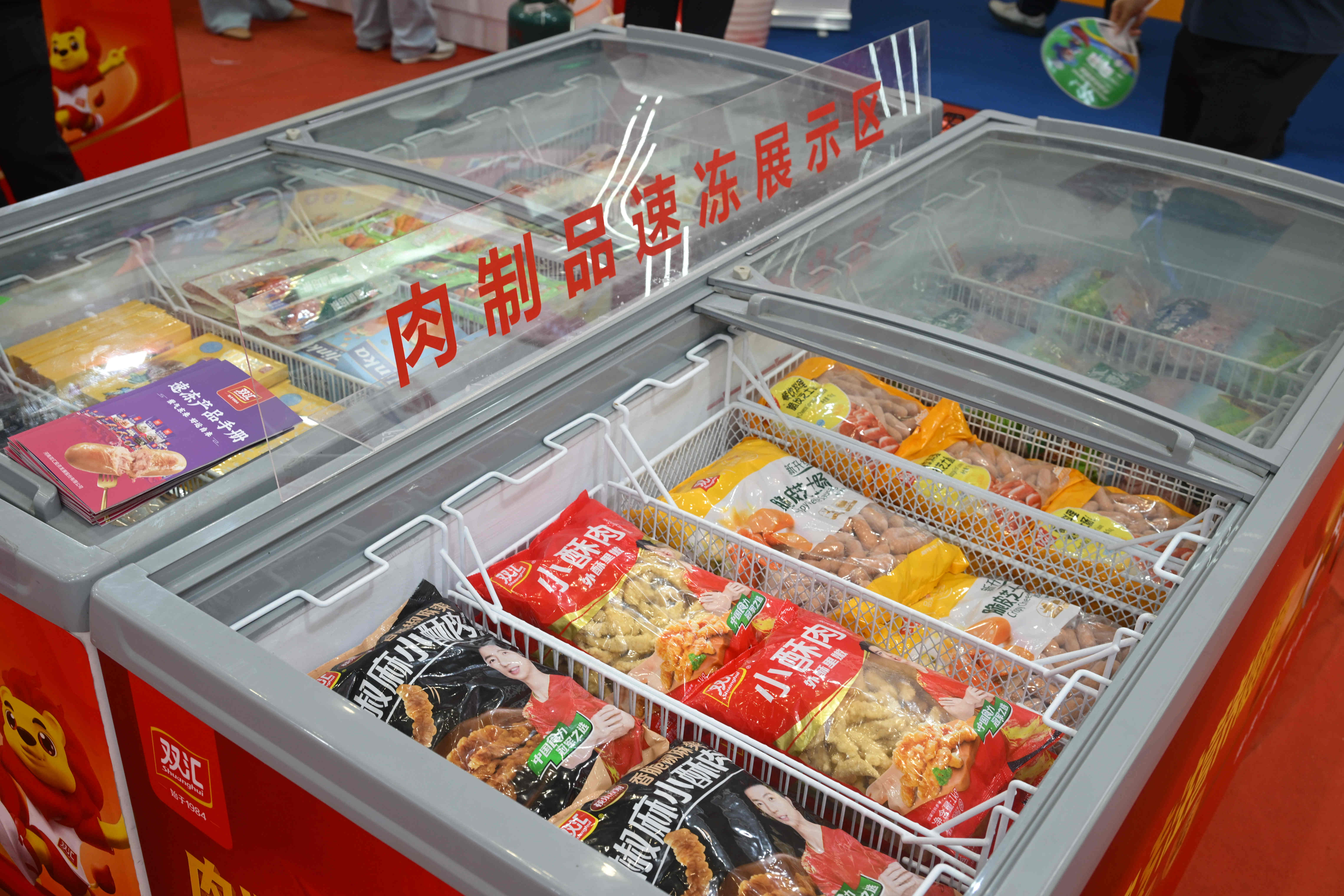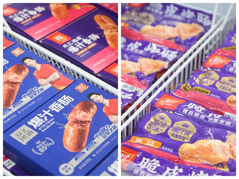 展柜內(nèi),Berlinka早餐肉蔬卷、極菲牛排、超值培根、炸豬排、亞麻籽雞肉餅、熱狗腸等特色產(chǎn)品,蒜香排骨、醬香肥腸、酸菜魚、豬肚雞等菜肴系列,香煎雞排、香酥雞塊、奧爾良風(fēng)味雞翅中、雞肉洋蔥圈等調(diào)理雞產(chǎn)品,丸子、肉卷、小酥肉、親親腸、芝士脆皮腸等火鍋食材,也充分展現(xiàn)了雙匯在產(chǎn)品創(chuàng)新方面的全新探索。