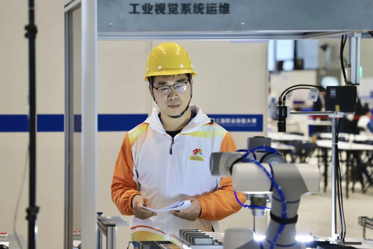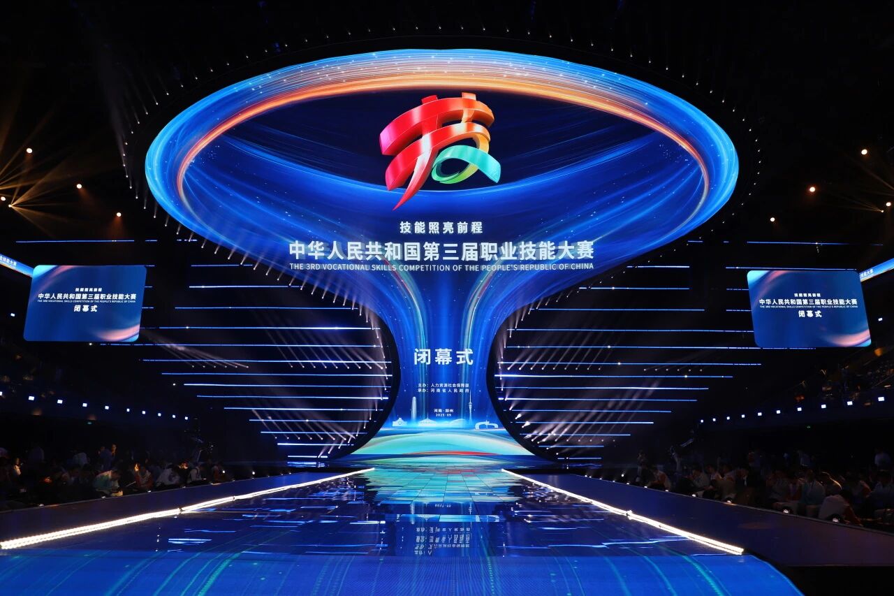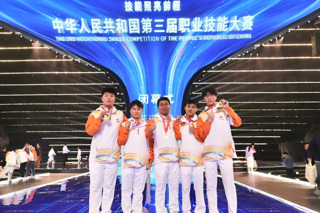 中華人民共和國第三屆職業(yè)技能大賽閉幕式上,自主移動(dòng)機(jī)器人(世賽選拔項(xiàng)目)金牌獲得者楊奇瑞、介明鑫,工業(yè)視覺系統(tǒng)運(yùn)維(國賽精選項(xiàng)目)金牌獲得者王華磊,機(jī)器人系統(tǒng)集成(世賽選拔項(xiàng)目)銀牌獲得者彎有道、王永康上臺(tái)領(lǐng)獎(jiǎng)。