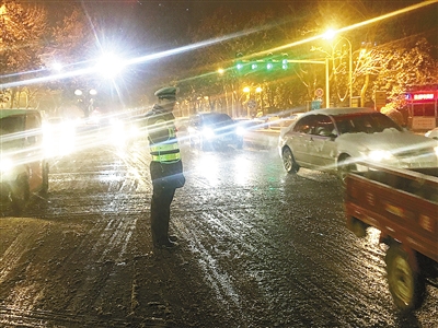 記者在多個(gè)路口看到,許多民警也在冒雪指揮交通。記者了解到,市區(qū)的輔警和騎警全員出動(dòng),且大部分從下午上崗到晚上7點(diǎn),沒有休息過一分鐘。