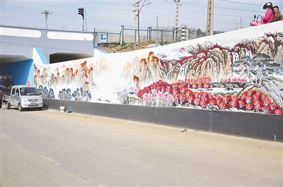 (記者 齊 放 實 習 生 李博昊)崇山峻嶺,漫山紅遍,大好河山盡收眼底;藍天白云,賞心悅目……昔日單調(diào)的涵洞有了“色彩”。3月25日下午,記者在郾城區(qū)龍城鎮(zhèn)十五里店村通往仲李村的孟平鐵路涵洞處,看到多名施工人員正在美化涵洞。