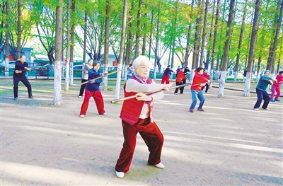 75歲的白香蓮正在練太極養(yǎng)生杖。