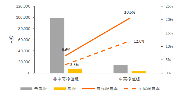 白皮書指出,約有20.6%中高凈值家庭配置了商業(yè)健康險,中高凈值家庭中成員擁有商業(yè)健康險比例為12%。與之相對,非中高凈值家庭這兩項數(shù)據(jù)分別為6.6%和3.3%。由此可見,無論在個人還是家庭層面,中高凈值家庭商業(yè)健康險覆蓋面更廣,覆蓋程度也更深。