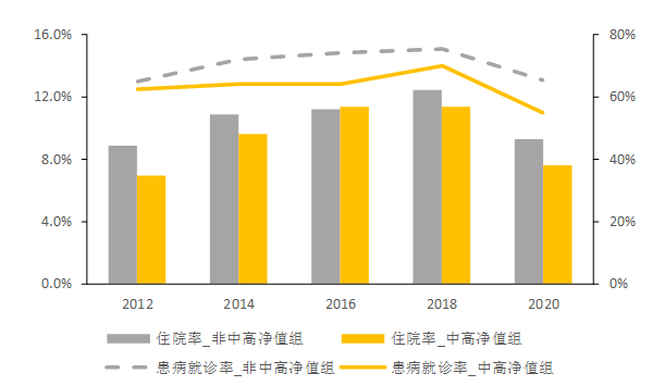 白皮書顯示,中高凈值人群的住院率和患病就診率均低于非中高凈值人群,醫(yī)療資源使用頻率偏低。與之相對,中高凈值人群的住院費用及年度家庭醫(yī)療總開支卻明顯更高,這意味著其在使用醫(yī)療服務(wù)資源時追求更高層次的服務(wù)需求。