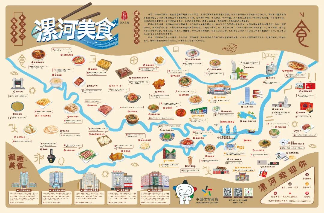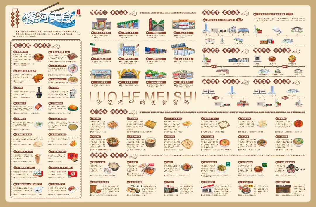 一圖在手,從清晨巷口的胡辣湯起步 —— 骨湯辛香裹著油餅,是本地人最踏實的開場。順著早餐攤的熱氣,能串聯(lián)起霓虹閃爍的核心商圈,一塊熱乎醬豆餅就是漯河的煙火暗號。