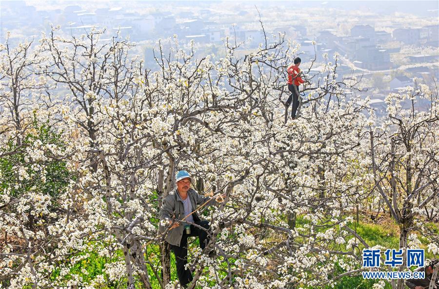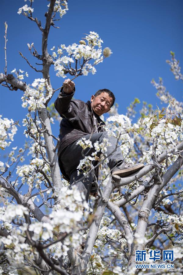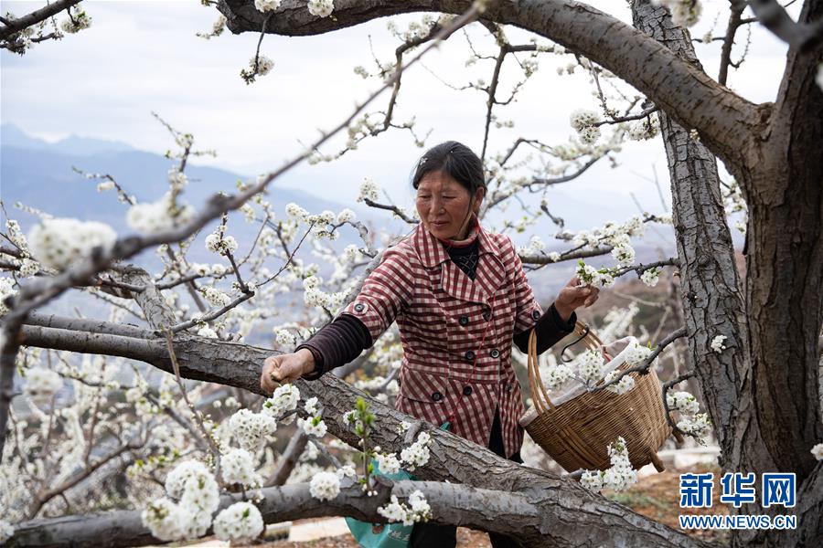 3月19日,漢源縣九襄鎮(zhèn)新堰村村民對梨花人工授粉。 隨著氣溫回升和春雨到來,四川省漢源縣九襄鎮(zhèn)等地的村民投入到疏花、人工授粉、育苗等農(nóng)業(yè)勞動中。 新華社記者 江宏景 攝