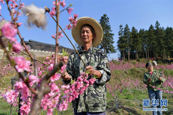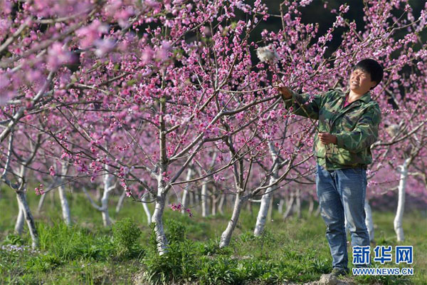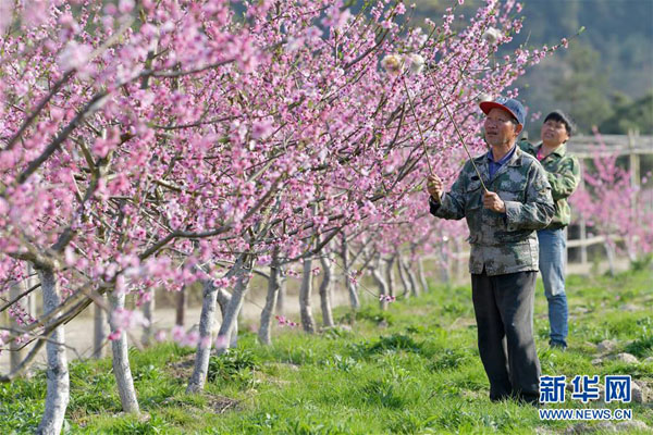 在南昌市灣里區(qū)太平鎮(zhèn),農(nóng)民在桃園基地內(nèi)對(duì)桃樹進(jìn)行人工授粉(3月19日攝)。新華社記者 彭昭之 攝