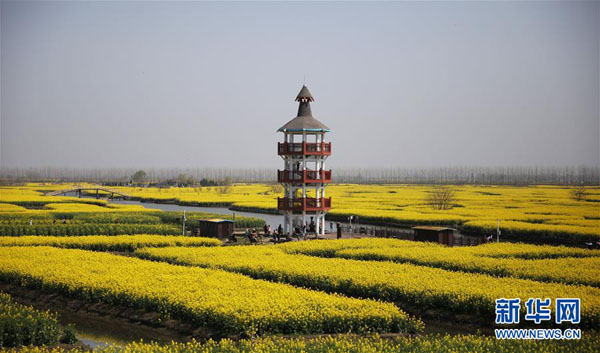 3月18日,游客在江蘇省興化市千垛景區(qū)拍照。 近日,正值江蘇省興化市千垛景區(qū)萬畝油菜花盛開期,金燦燦的油菜花在水道圍成的垛田上形成一片片金黃色的“花海”,形成了“河有萬灣多碧水,田無一垛不黃花”的壯觀景色。 新華社記者 李雨澤攝