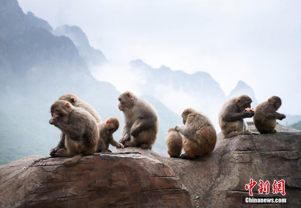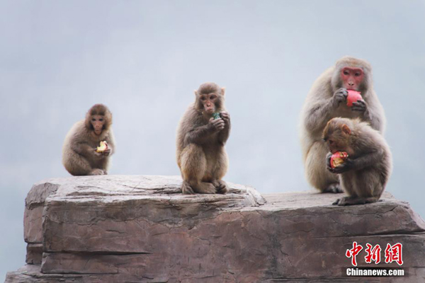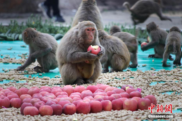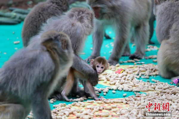 5月9日,在母親節(jié)到來之際,在位于河南濟源的太行山獼猴國家自然保護區(qū)——五龍口,工作人員為猴媽猴寶們添加營養(yǎng)餐,祝愿它們“母子平安”,現(xiàn)場用獼猴最愛吃的花生等拼成中國結(jié)圖案。圖為野生獼猴在進食。中新社記者 王中舉 攝