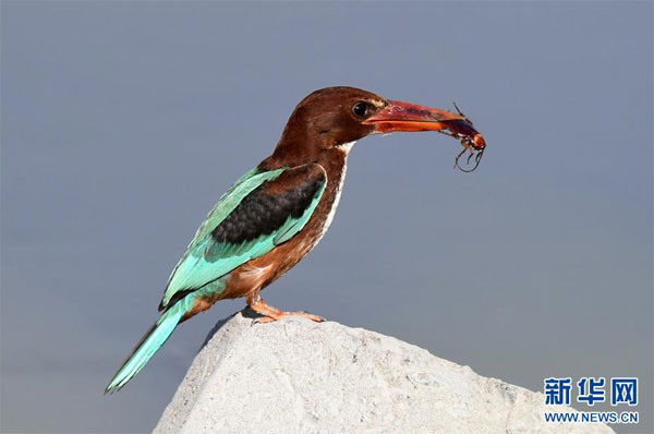 7月7日,在科威特首都科威特城海濱,一只白胸翡翠在鳴叫。 新華社發(fā)(哈齊 攝)