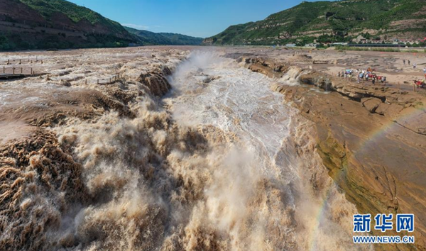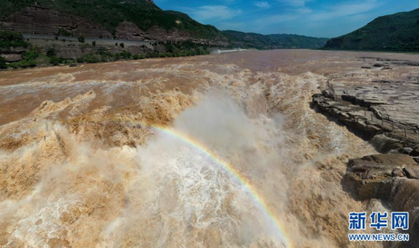 7月7日,黃河壺口瀑布主瀑上出現(xiàn)彩虹(無人機(jī)照片)。 近日,位于秦晉大峽谷的黃河壺口瀑布出現(xiàn)難得一見的“金色瀑布”景觀。 新華社記者 陶明 攝