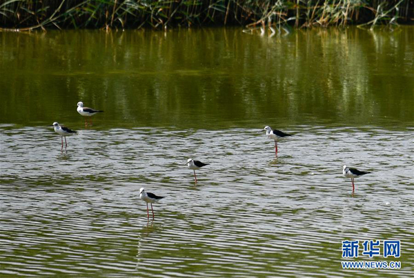 7月23日,黑翅長腳鷸在天津大黃堡濕地自然保護區(qū)內覓食。新華社發(fā)(孫凡越 攝)
