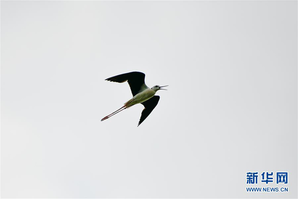 7月23日,一只黑翅長腳鷸在天津大黃堡濕地自然保護區(qū)上空飛翔。新華社發(fā)(孫凡越 攝)
