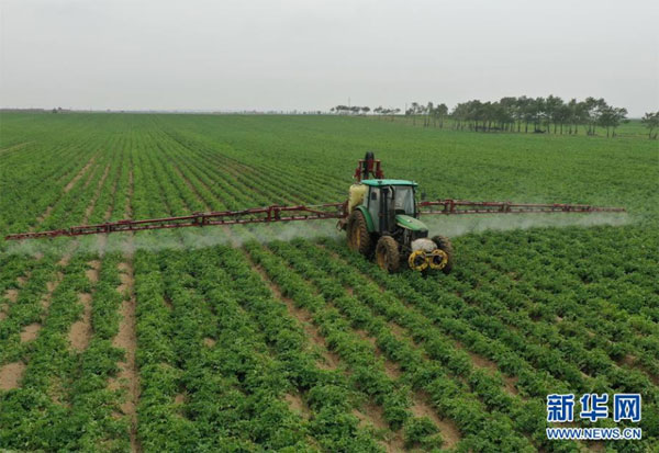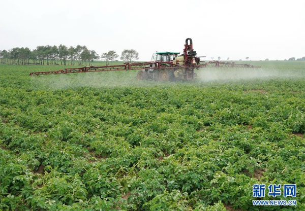 8月12日,在尚義縣三工地鎮(zhèn)有德元村,農(nóng)民使用機(jī)械設(shè)備在田間給旱作馬鈴薯噴灑農(nóng)藥。 近年來,地處壩上地區(qū)的河北省尚義縣大力實(shí)施地下水超采綜合治理,積極探索旱作雨養(yǎng)種植技術(shù),發(fā)展馬鈴薯、莜麥和油葵等旱地農(nóng)作物,促進(jìn)生態(tài)環(huán)境恢復(fù)。據(jù)介紹,該縣2019年以來,先后關(guān)停灌溉用井1200余眼,旱地改草23萬畝,水澆地改旱地11萬畝。 新華社記者 楊世堯 攝