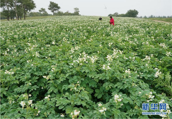 8月12日,在尚義縣七甲鄉(xiāng)媽奶溝村,農(nóng)民在田間管護(hù)旱作馬鈴薯。 近年來,地處壩上地區(qū)的河北省尚義縣大力實(shí)施地下水超采綜合治理,積極探索旱作雨養(yǎng)種植技術(shù),發(fā)展馬鈴薯、莜麥和油葵等旱地農(nóng)作物,促進(jìn)生態(tài)環(huán)境恢復(fù)。據(jù)介紹,該縣2019年以來,先后關(guān)停灌溉用井1200余眼,旱地改草23萬畝,水澆地改旱地11萬畝。 新華社記者 楊世堯 攝