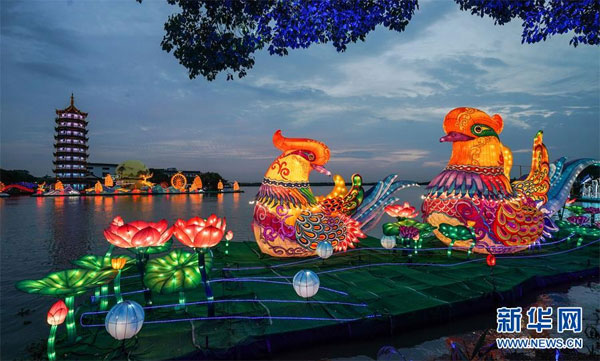 9月28日拍攝的“情意綿綿”燈組(前右)與“月滿周莊”燈組(后左)。 當(dāng)日,2020海峽兩岸(昆山)中秋燈會在江蘇昆山開幕,為期一個月。燈會設(shè)置的水鄉(xiāng)周莊燈區(qū)以水鄉(xiāng)、古鎮(zhèn)、田園江南為依托,將傳統(tǒng)彩燈與現(xiàn)代光影藝術(shù)相融合,打造“水韻芳華”夜周莊。 新華社記者 楊磊 攝