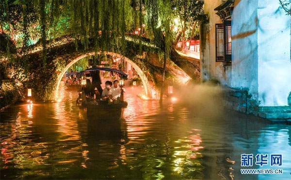 9月28日,游客乘船游覽燈光璀璨的水巷。 當(dāng)日,2020海峽兩岸(昆山)中秋燈會在江蘇昆山開幕,為期一個月。燈會設(shè)置的水鄉(xiāng)周莊燈區(qū)以水鄉(xiāng)、古鎮(zhèn)、田園江南為依托,將傳統(tǒng)彩燈與現(xiàn)代光影藝術(shù)相融合,打造“水韻芳華”夜周莊。 新華社記者 楊磊 攝