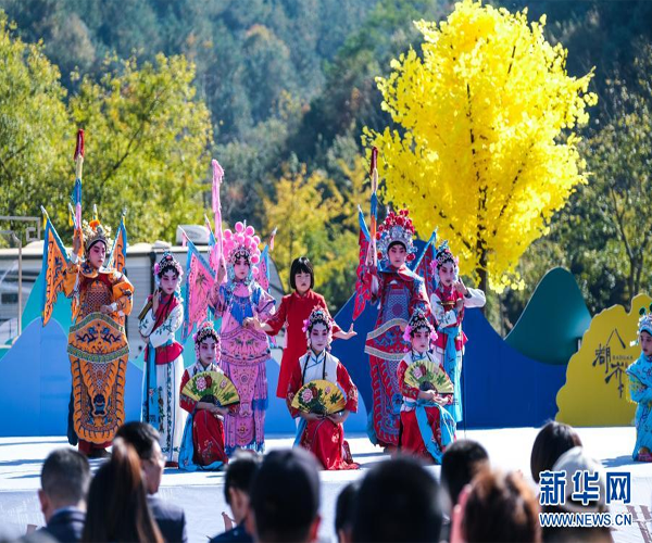 11月12日,在“十里古銀杏長(zhǎng)廊”景區(qū)內(nèi),小浦鎮(zhèn)中心小學(xué)“小京班”的孩子在為游客表演京劇。新華社記者 徐昱 攝