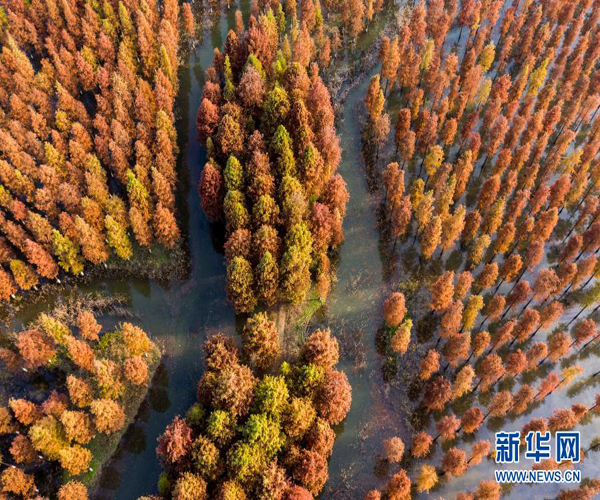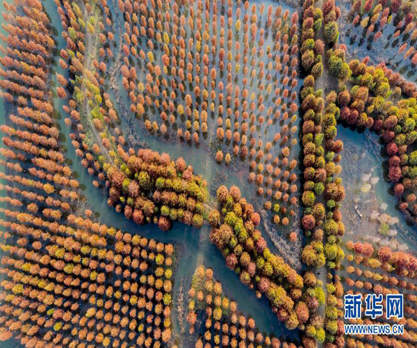 這是11月15日拍攝的江蘇省泗洪縣洪澤湖濕地杉樹林景色(無人機照片)。初冬時節(jié),洪澤湖濕地中的杉樹林猶如披上多彩外衣,色彩斑斕,美不勝收。新華社發(fā)(許昌亮 攝)