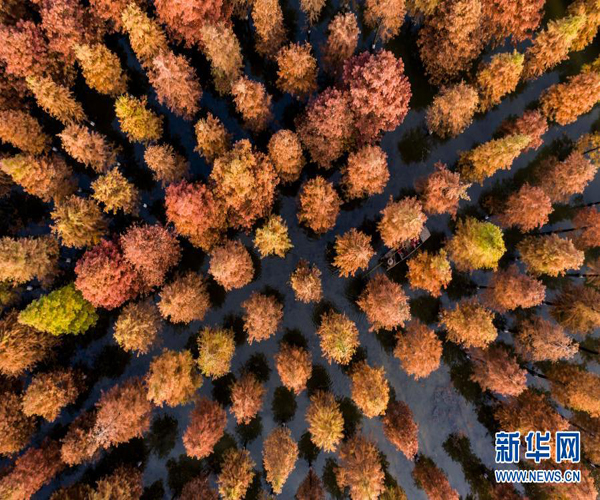 11月15日,游人在江蘇省泗洪縣洪澤湖濕地的杉樹林中游覽。初冬時節(jié),洪澤湖濕地中的杉樹林猶如披上多彩外衣,色彩斑斕,美不勝收。新華社發(fā)(許昌亮 攝)