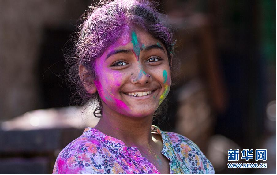 3月10日,在印度新德里,一名女孩參加灑紅節(jié)慶?;顒?。