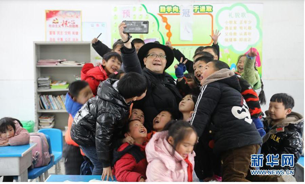 2020年12月17日,植國明在大灣小學(xué)和孩子們自拍。新華社記者 曹力攝