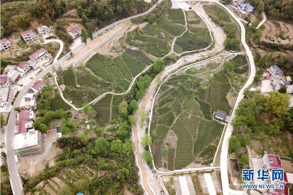 這是2020年4月17日拍攝的金寨縣花石鄉(xiāng)大灣村的茶產(chǎn)業(yè)扶貧基地(無人機(jī)照片)。新華社記者劉軍喜攝