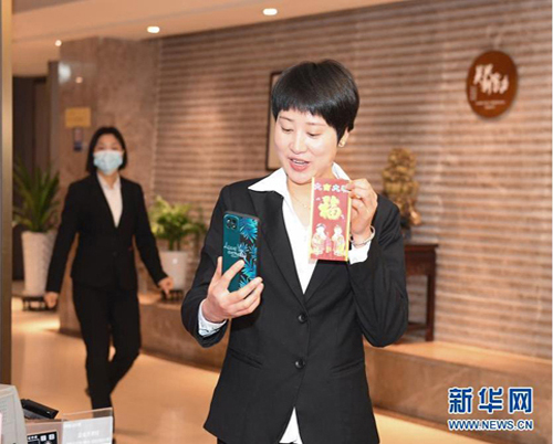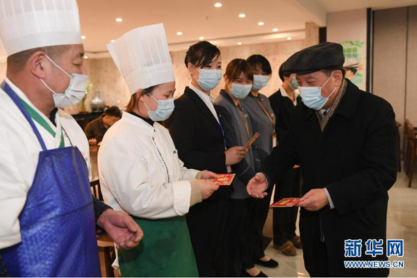 1月22日,一家酒店工會主席為就地過年的外地員工送上暖心紅包。新華社記者 翁忻旸 攝