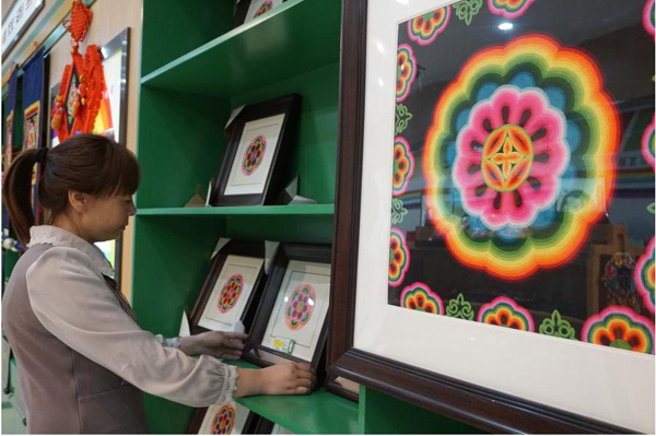 青海省海東市互助土族自治縣的土族盤(pán)繡園內(nèi)擺放的“太陽(yáng)花”裝飾畫(huà)(3月5日攝)。新華社記者 央秀達(dá)珍 攝