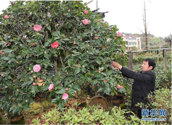 3月10日,后溪河村花農(nóng)何衛(wèi)明在修剪茶花。