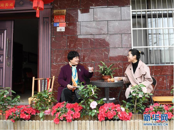 3月10日,后溪河村村民在鮮花簇?fù)淼耐ピ毫奶臁?/div>