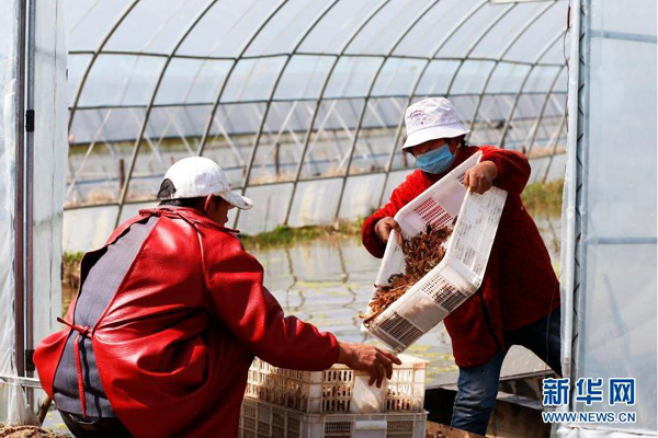 3月23日,泗洪縣龍集鎮(zhèn)蝦農(nóng)在大棚外分揀捕撈出水的小龍蝦。