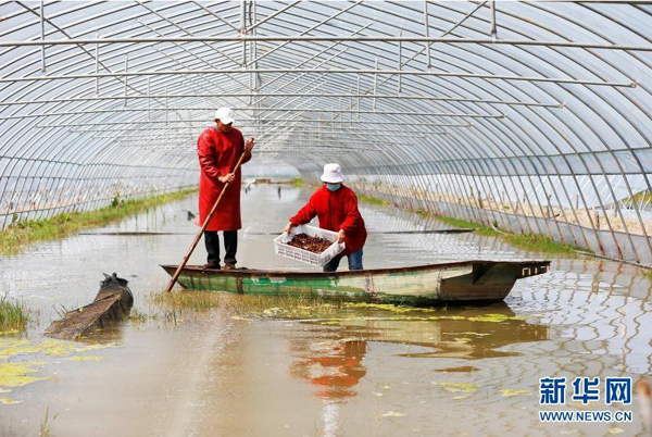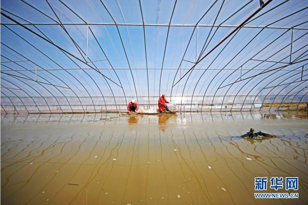 3月23日,泗洪縣龍集鎮(zhèn)蝦農(nóng)在大棚內(nèi)捕撈小龍蝦。
