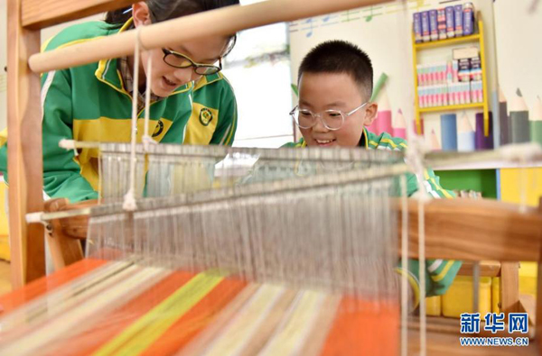 4月7日,威縣第四小學(xué)學(xué)生在體驗(yàn)老粗布紡織技藝。近年來,河北省邢臺市威縣積極開展“非遺傳承進(jìn)校園”活動(dòng),將當(dāng)?shù)靥厣沁z項(xiàng)目引入學(xué)校課堂,讓學(xué)生近距離感受民間傳統(tǒng)技藝的魅力,促進(jìn)非遺文化的保護(hù)和傳承。新華社記者 朱旭東 攝